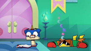 Overview: Unikitty and Puppycorn just want to veg out on Lazy Sunday, but it is also Chore Day, and Richard keeps trying to force chores on them. They try to escape him by being lazy pirates, and set sail using the couch as a pirate ship to rescue Dr. Fox and Hawkodile from chores, but when they enter Unikitty's room, which is a big mess, Richard uses this as an advantage to get them to do chores by joining the pirate idea and shoot cleaning supplies at them.